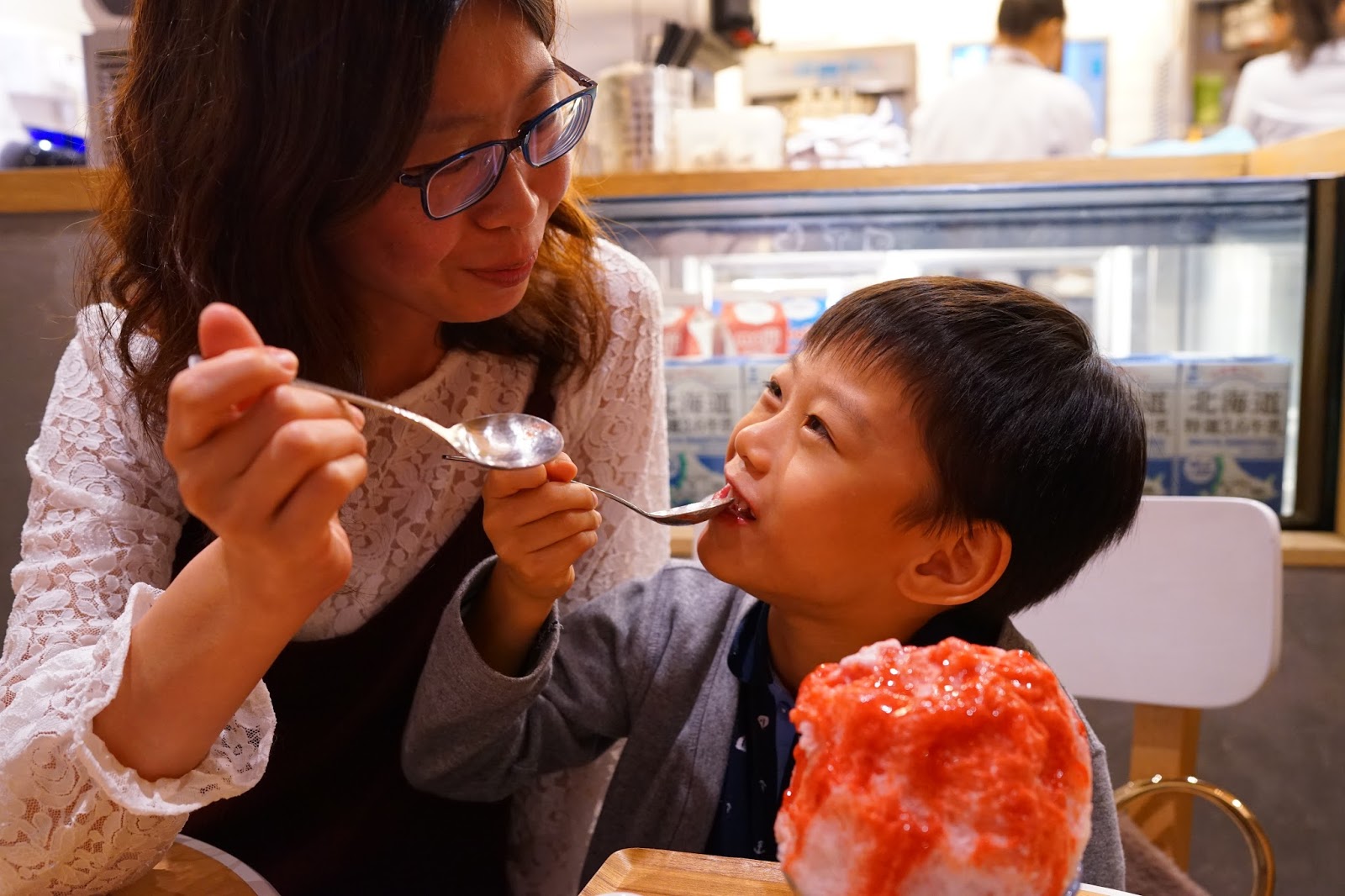 我同一家叫多一客幻之羽手先就埋單,走去附近既日式雪糕店食甜品.幸男同人家一齊分一個士多啤梨甜品,食得好開心.行去260X巴士站時,見商廈外牆已掛好聖誕燈飾,於是係天橋上砌好相機同閃燈,為兩母子影合照.