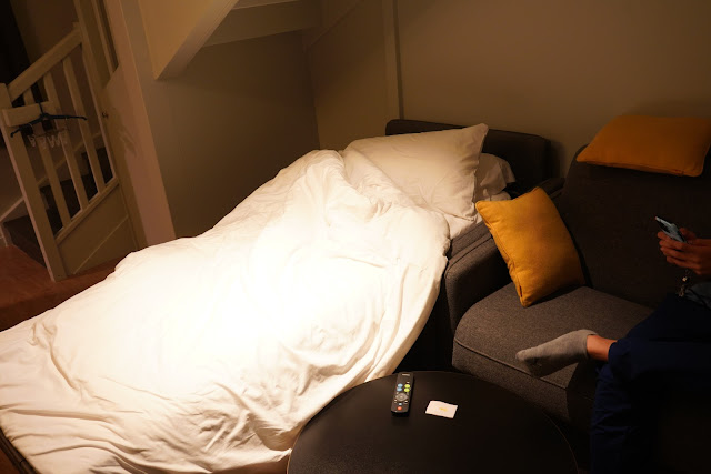 未夠鐘食晚飯,所以番上去酒店房hea吓先。Lobby行樓梯上一層,入到房有廁所浴室同小開放式廚房,有枱有梳化同電視。幸男就訓其中一張梳化床,我同領隊就要行上多一層閣樓訓雙人床。